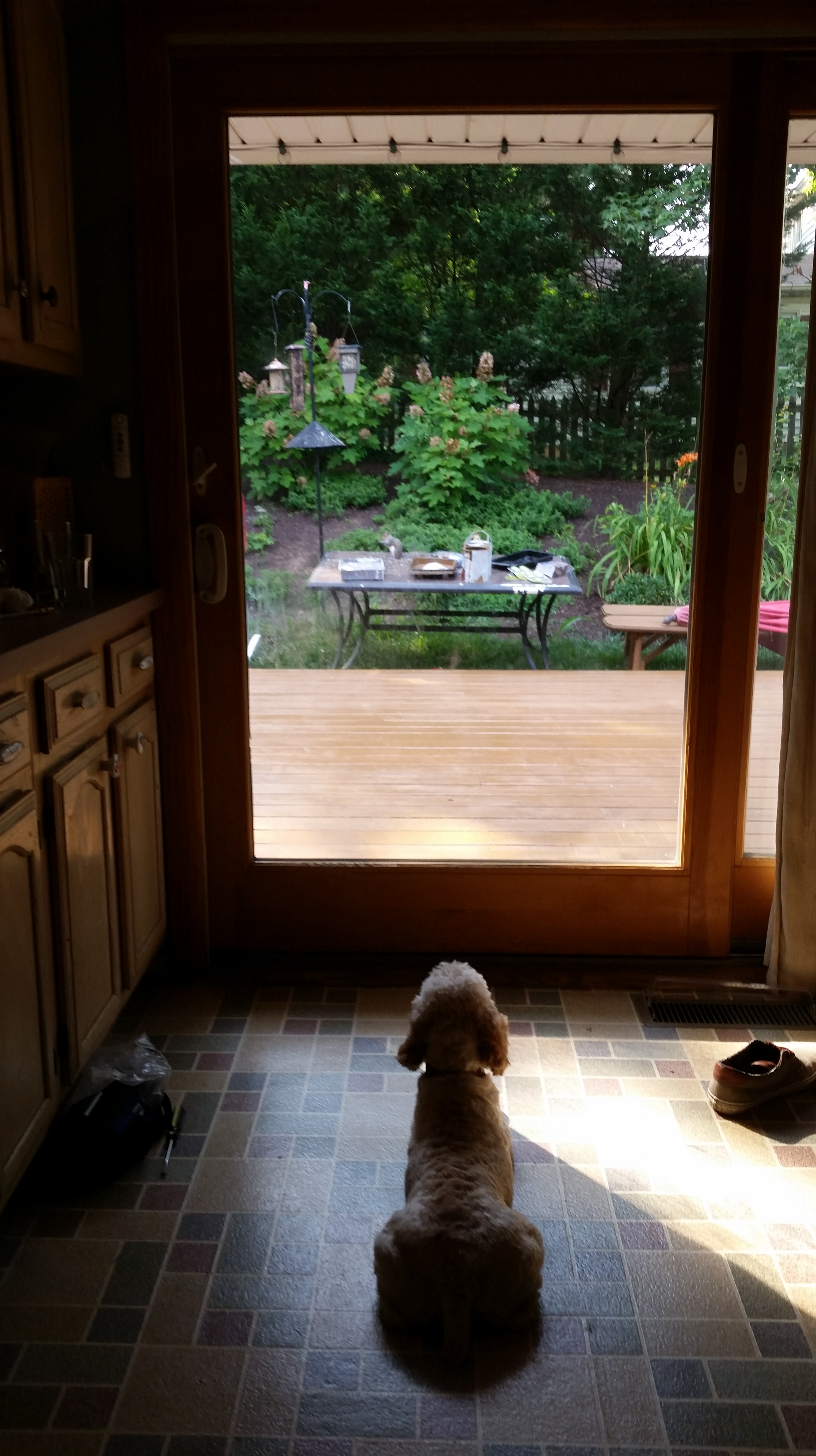 Later on, after I’m bathed, dressed, out of bed and at work, she safety-tastes my morning repast, and assumes her ever-vigilant office watchdog posture. She safety-tastes my lunch, escorts me to precisely scheduled bathroom visits, scratches at the slider to take her own comfort-breaks, scratches at the slider to come back inside, and is given a ca